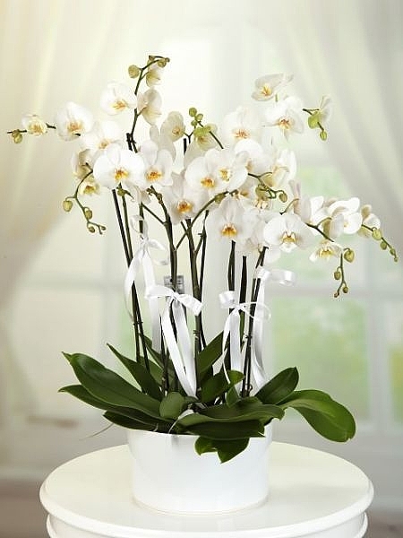 beyaz seramik içerisinde 8 dallı beyaz orkideler kupon orkide boylu