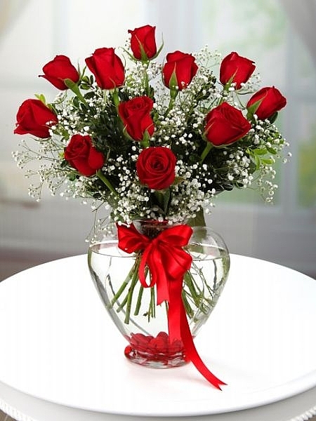 ŞEFFAF YADA KIRMIZI KALP VAZO İÇERİSİNDE 11 ADET KIRMIZI GÜL