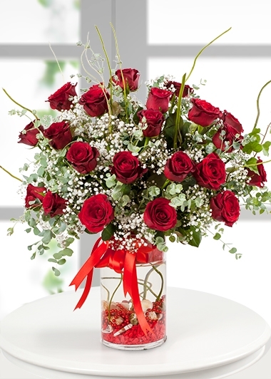 silindir vazoda 29 adet kırmızı gül arajmanı