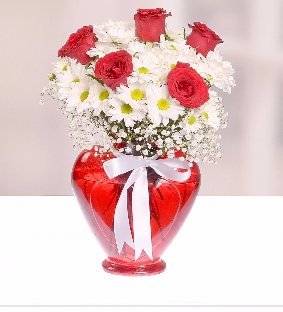 kırmızı kalp vazoda krizantem papatyalar ve 5 adet kırmızı güller