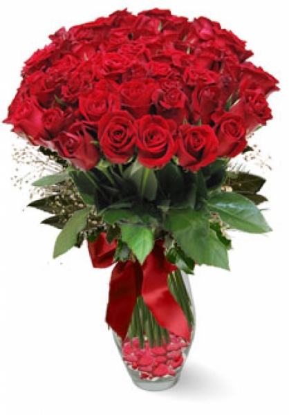 cam vazoda 50 kırmızı gül (vazonun şekli ve yeşillikler stok durumuna göre değişebilir)
