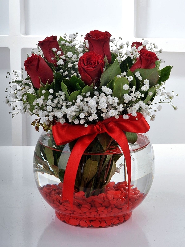 AKVARYUM CAM İÇERİSİNDE 7 ADET KIRMIZI GÜLLER
