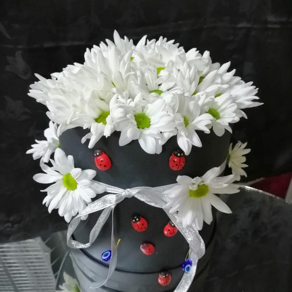 siyah kutu içerisinde beyaz papatyalar..