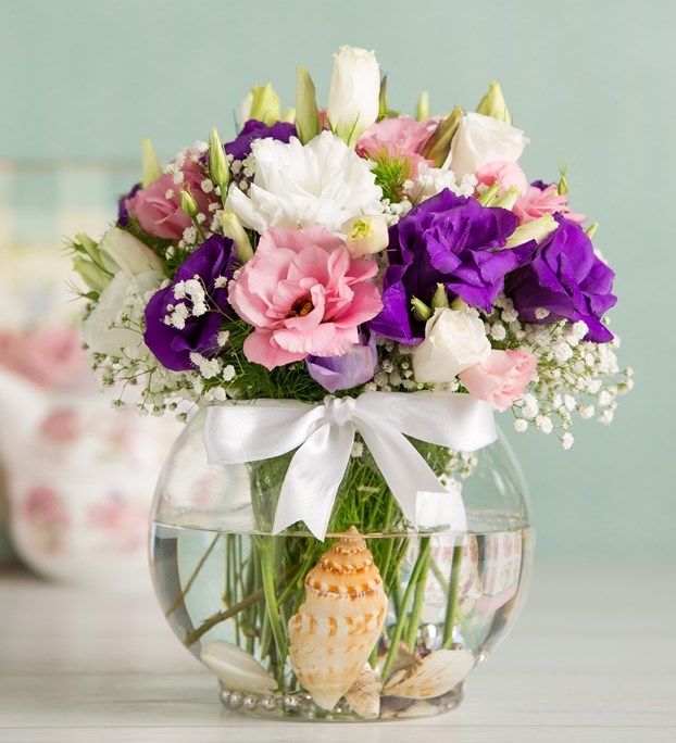 cam faunusta lusiantuslar krizantemler cipso ile hazırlanmış şık bir arajman