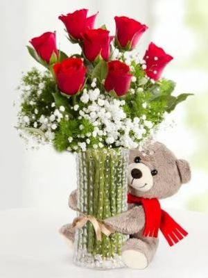 SİLİNDİR CAM VAZODA 7 GÜLLÜ AYICIKLI ARAJMAN