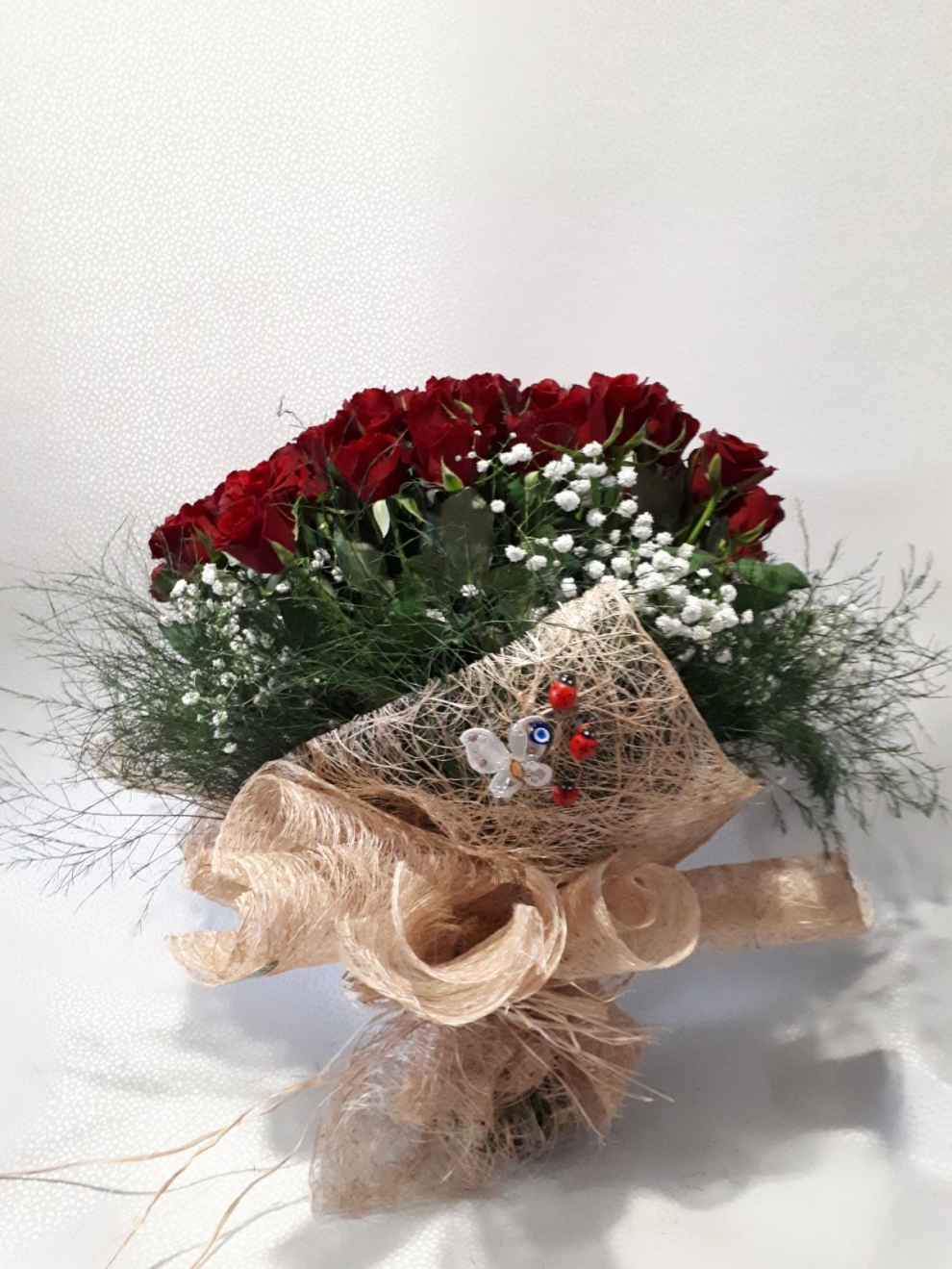 25 adet güllerden hazırlanmış şık bir gül buketi(stok durumuna göre ürün dış kaplaması farklı olabilir)