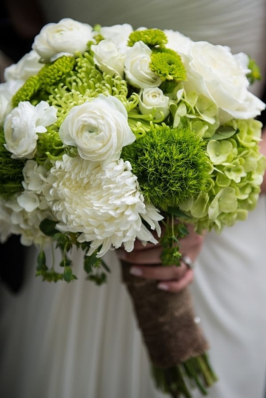 yeşil beyaz çiçeklerden hazırlanan top model gelin el buketi canlı çiçektir